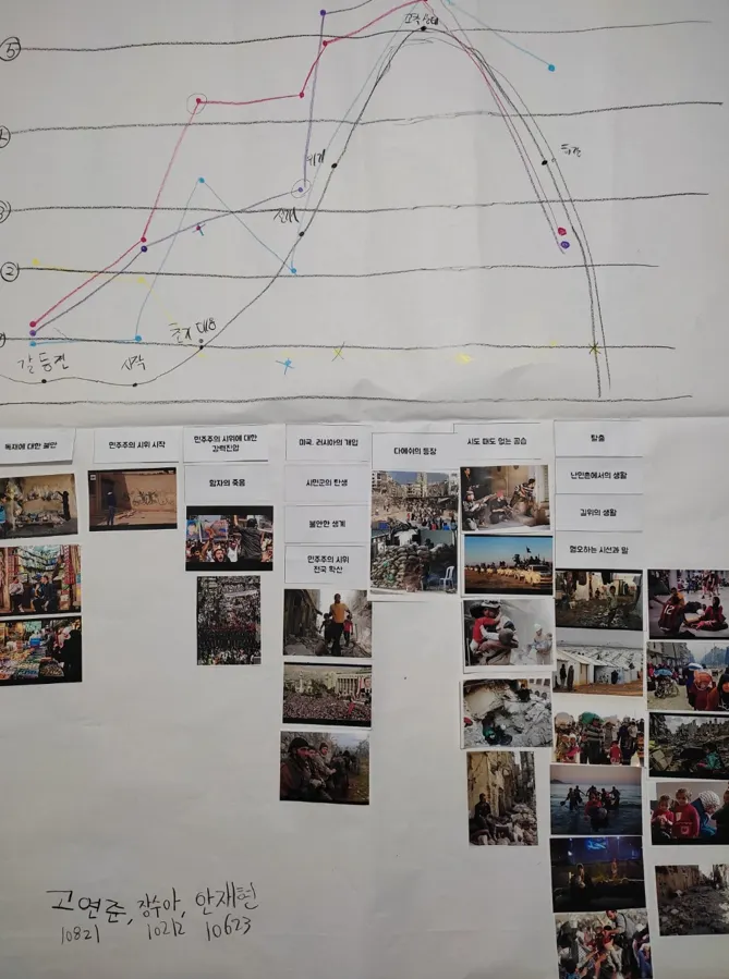 - 갈등지도를 통해 시리아 내전을 분석한 후, 분쟁으로 진행되지 않을 수 있는 지점을 찾은 후에 각 주체별 필요한 태도를 살펴본다. 두 번째 챕터로 각 사건에 해당하는 사진을 붙여 분쟁으로 인한 사람들의 삶의 변화를 가시적으로 드러내는 활동.